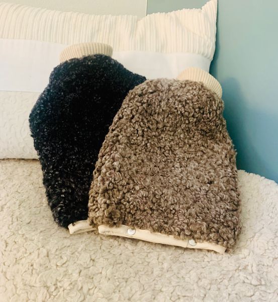 Diese Bettflaschen mit curly Lammfell Überzug sind sehr schlicht und einfach gearbeitet und damit einfach richtig cool. Der Abschluss oben beim Verschluss ist mit einem Baumwollbündchen gefertigt, und haben Sie den Abschluss mit einem Baumwollband und Druckknöpfen. Sehr praktisch! Im Testgebrauch zeigt auch, es funktioniert bestens, wenn man den Überzug abnehmen will.
